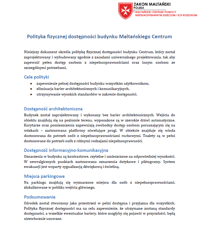 5. W Maltańskim Centrum Pomocy fizjoterapia prowadzona jest wyłącznie w oparciu o zalecenia lekarza rehabilitacji zatrudnionego w Centrum. W związku z tym rodzice dzieci, które w ramach programu terapeutycznego mają zaplanowaną fizjoterapię zobowiązani są do konsultacji lekarskich nie rzadziej niż raz na 6 miesięcy. Bez aktualnych zaleceń lekarza fizjoterapia będzie wstrzymywana.